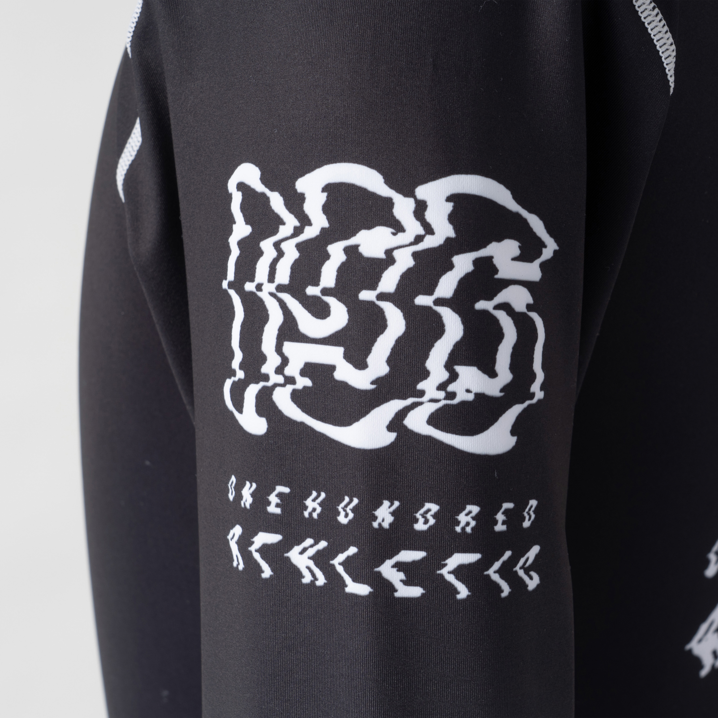 イラストレーターの平沼久幸氏による100Aロゴの「めまい」バージョンが描かれた、ロングスリーブラッシュガード。