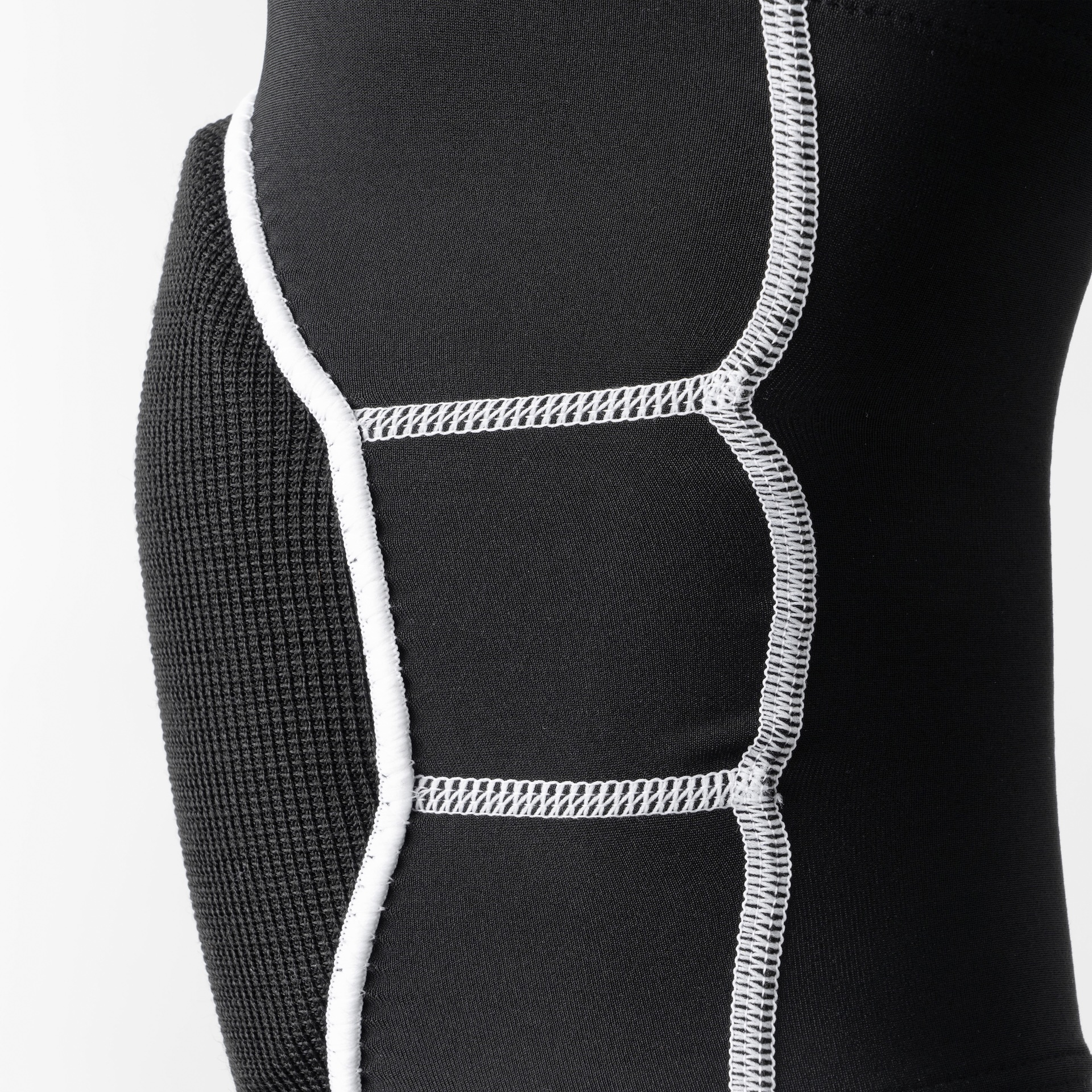 高反発と低反発を重ねた2層構造でありながら厚さを13mmに抑えたワイドパッドを採用し膝頭周囲まで保護。膝の動きに順応し関節部分とパッドがぴったりフィット(左右どちらでも対応)。素材も肌に当たる内側部分は起毛加工が施され、軽量かつ吸汗速乾性に優れ、抗菌機能を備えております。スパーリング中にタックルなどの動作でマットに膝をつくときの衝撃を減らしますので膝のケガ予防にも最適です。